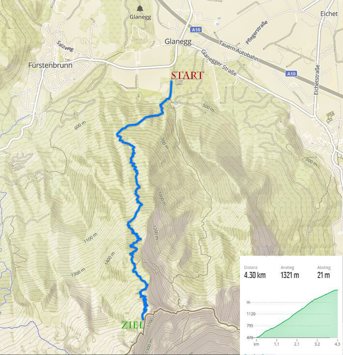 Gestartet wird von Glanegg aus, aus 500 Höhenmetern. Hinauf über den Reitsteig, vorbei am Zeppezauerhaus bis ans Ziel, welches kurz unter dem Gipfel „Geiereck“ liegt.